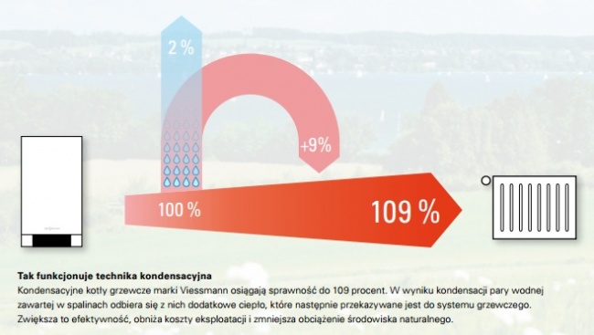 Kondensacyjne kotły firmy Viessmann pracują ze średnioroczną sprawnością nawet 109%. Dla porównania nowy tradycyjny kocioł gazowy firmy Viessmann posiada sprawność 91%. Kotły kondnseacyjne jeszcze lepiej wypadają w porównaniu z kotłami gazowymi starymi – tu różnica w sprawności może sięgać nawet 40%. Inwestując w kondensacyjny kocioł gazowy zużywa się mniej energii, co oznacza wymierną korzyść finanową, jak również troskę o otaczające nas środowisko (mniejsza emisja dwutlenku węgla).