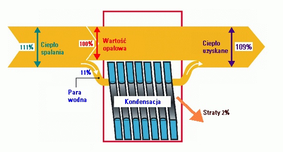 Kotły gazowe nowej technologii – tzw. kotły kondensacyjne czy też kotły kondensujące – wykorzystują ciepło zawarte w cząstkach pary wodnej. Odbywa się to w ten sposób, iż spaliny są w kotle ochładzane przez powracającą wodę grzewczą. W ten sposób para wodna w spalinach kondensuje, oddając ciepło wodzie grzewczej.