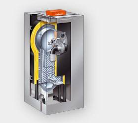 - Korpus kotła o dużej pojemności wodnej, z powierzchniami grzewczymi Inox-Crossal z wysokogatunkowej stali kwasoodpornej, zapewniający efektywne wykorzystanie ciepła kondensacji