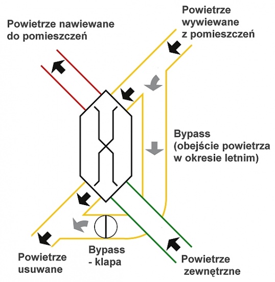 - Dostępny jako opcja dodatkowa układ obejściowy powietrza (Bypass) dla pracy w okresie letnim (eliminacja zbędnego podgrzewania powietrza nawiewanego).